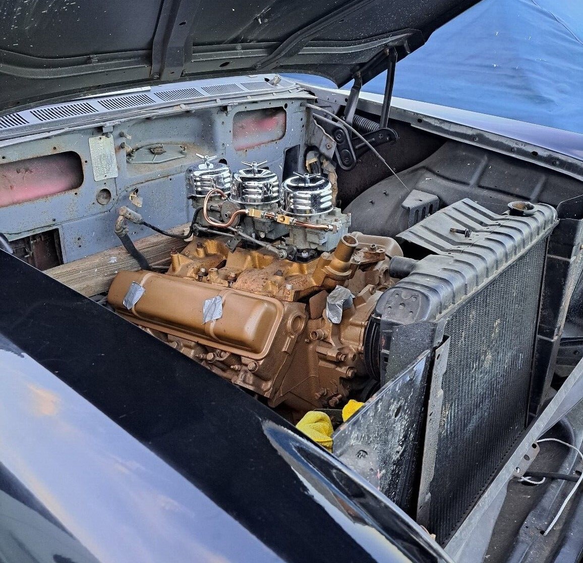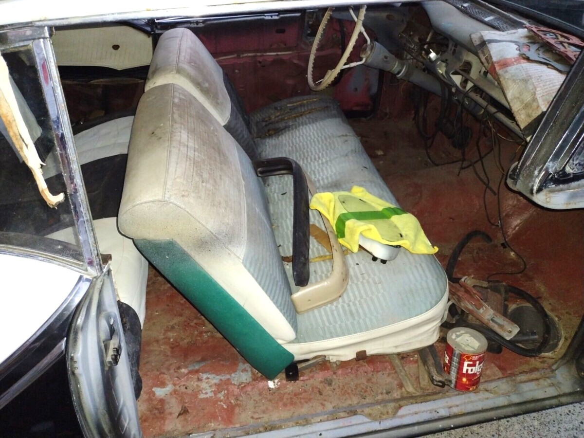 The seller’s Holiday Coupe is one of about 49,000 built in 1957, regardless of the engine set-up. It also has the Jetaway Hydra-Matic transmission which was optional except on the top-end 98. The photos provided by the seller show the car in a variety of settings, so we’re not sure which one fits the current arrangement (outside, two garages, back of a trailer, etc.). We’re told the cowl tag suggests this car was one of the earliest examples built for that model year. While no mention is made of the “Six-Pack” motor or transmission being original, the seller says that they have been “gone through” but are just sitting in place waiting to be installed.