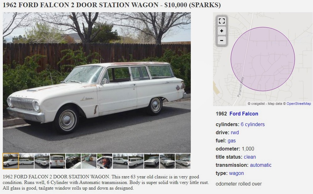 We’ve only seen two or three examples of a 1962 Ford Falcon Two-Door (or Tudor) Wagon here on Barn Finds over the years. And one two-door sedan delivery version, which would be the ultimate, at least for me. The seller has this decent-looking example posted here on craigslist in Sparks, Nevada, and they’re asking $10,000. Here is the original listing, and thanks to Zappenduster for the tip!