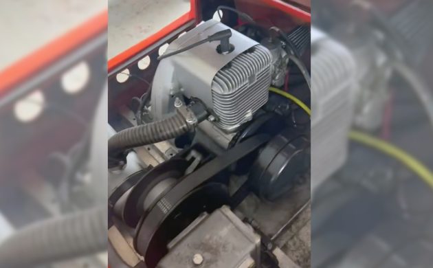 The seating area is as simple as it gets compared to other sleds from 1970. There isn’t even a speedometer here, and no other gauges at all that I can see, but it does have reverse and foot pedals for acceleration and braking. These last two photos are screenshots from the seller’s video. Sadly, most of the photos are vertical, and the video is even a vertical. I know, for a horizontal vehicle, it drives me nuts, too. Believe it or not, this rig has a single track, and all of the Snowbug snowmobiles had a single track. By 1970, the three models were the Snowbug, Superbug, and the Luvbug. The Luvbug was the bomb-diggity model, top of the pack. This track is 31.5 inches wide, and this sled weighs 450 pounds. That isn’t as much as it could be with aluminum and fiberglass construction keeping the weight down.