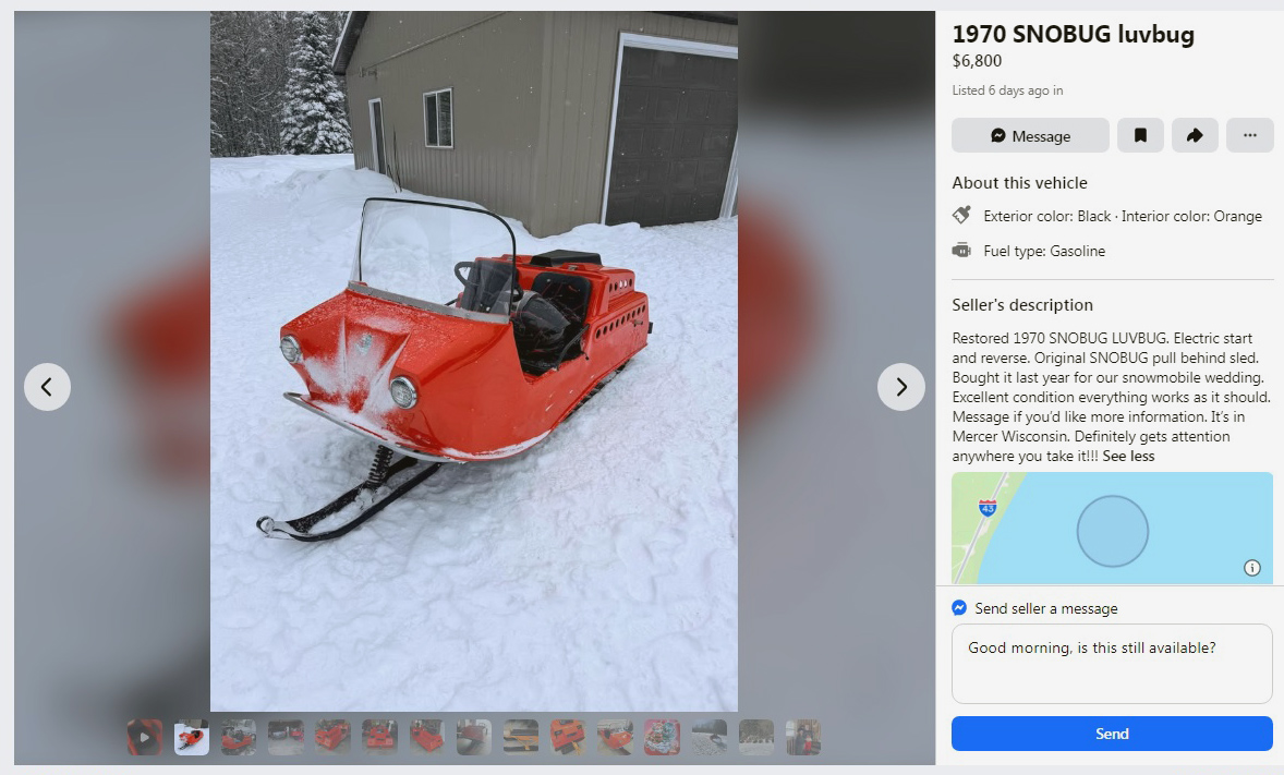 Somebody has incredible taste in vehicles, as seen in that Cadillac CTS-V wagon parked next to this equally incredible and rare snowmobile. This rarely-seen and unusual, made in Sudbury, Ontario, Canada, 1970 Snowbug Luvbug snowmobile is listed here on Facebook Marketplace. It can be found in an area that knows a thing or two about snow and snowmobiles: Mercer, Wisconsin, and they’re asking $6,800. Here is the original listing.