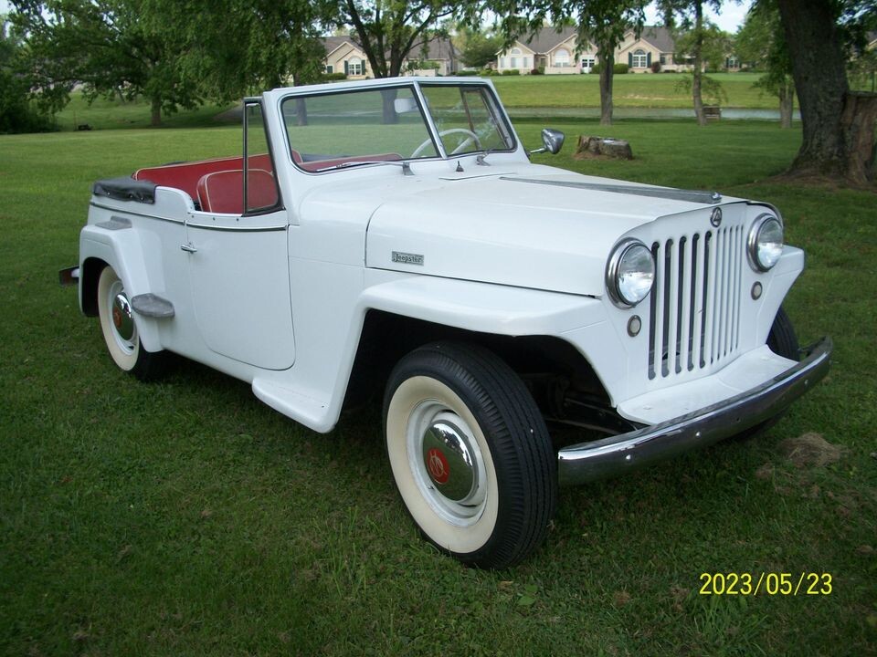 The simple interior looks to be in very good shape with a white painted dash and an overall no-nonsense look. The seller shares that the gauge’s needs to be wired up, though. Jeep touted their “Easy-posture seats upholstered in long-wearing, washable plastic material” in their sales literature. The red seats with the white piping makes for a nice contrast with the white paint and fits appropriately with the Jeepster’s image. I also like that cool, old-school steering wheel.