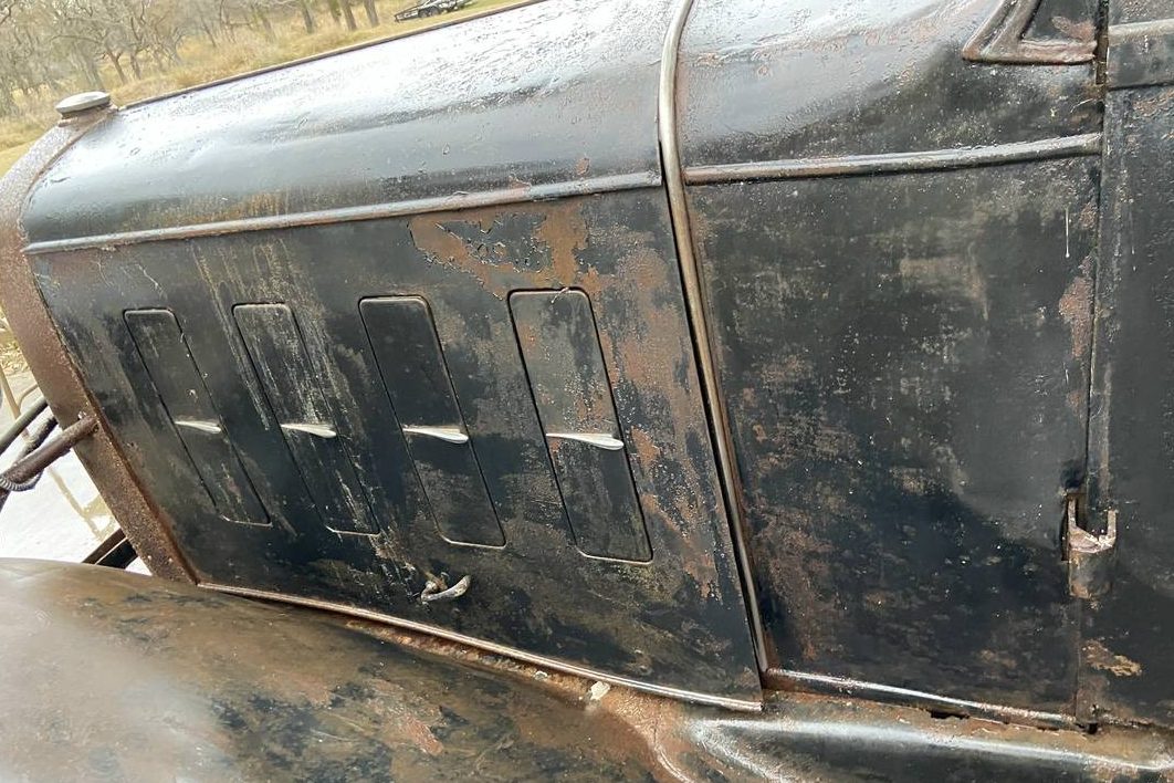 Plus, I’m sure the 2 front doors are NOT original to the car, as the belt line on the doors are different when compared to the cowl lines. Look at the close-up photo of the hood side, cowl, and the cowl line vs door line — Not even close. I suspect the cowl forward was original to an enclosed car, and they cut away the body from the cowl & windshield post back, then they added sedan front doors [the 2-door examples were too long], then the panel body. It was in the mid 1930s, and people made due with whatever they had. You made it work.