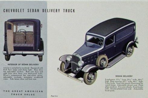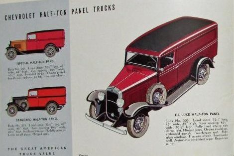 These three models differ slightly in size and Body Numbers.  Yes, the writing is barely legible, our apologies, but the pictures help a little.  Notice that these three trucks have louvers for the hood ventilation rather than the ventilator doors.  Note as well that the windshield is square at the bottom edge.  The Special Half-Ton Panel in the top left drawing has no spare tire in its fender–this may be significant.  For reference, here is the 1932 Chevy Sedan Delivery Brochure page: