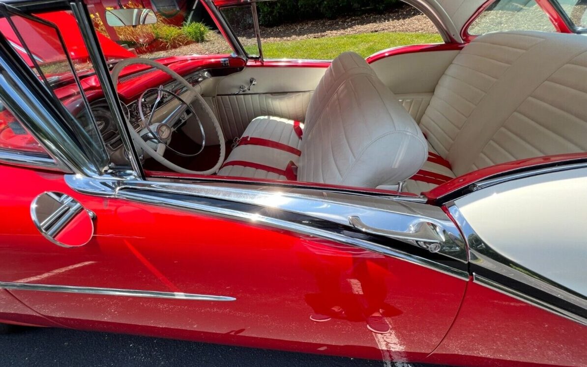 This has the original 57 Olds-only ‘Fiesta’ caps. Too bad the money spent on the interior was wasted, as it would need a complete re-do since it’s ALL wrong. And yes, that diving platform and fender skirts need to be deposited into the recycling bin! Absolutely hideous additions to an otherwise beautiful car.