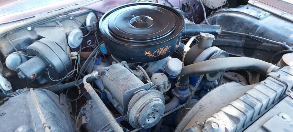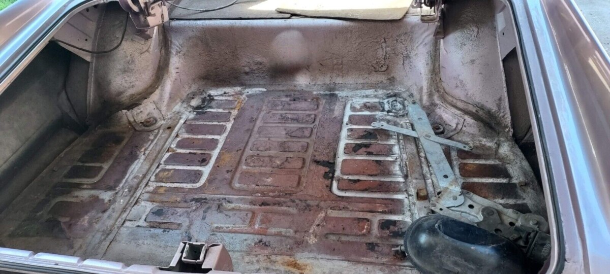The Caddy looks pretty good on the outside. The paint shines except possibly on the passenger’s side door. The seller also notes that the back panels on both sides are incomplete, though it’s not obvious what that means. The convertible top is new, though if I were to have done this one, I would choose a different color top—white probably. This much black vinyl is just not attractive. On the other hand, maybe the top would be down far more than up. Further, the interior, though weathered in a few spots, is lovely, and the odo shows just 49,000 miles, though who knows what the real number might be. The seller says the car is rust free, and it does appear so, but he calls out the trunk floor as a weak spot, and bingo! He’s right. It’s partly eaten away. That means that this one’s going on a lift, and maybe having the carpets taken up, before it’s going to be worthy of trust that other panels are not equally frightening.