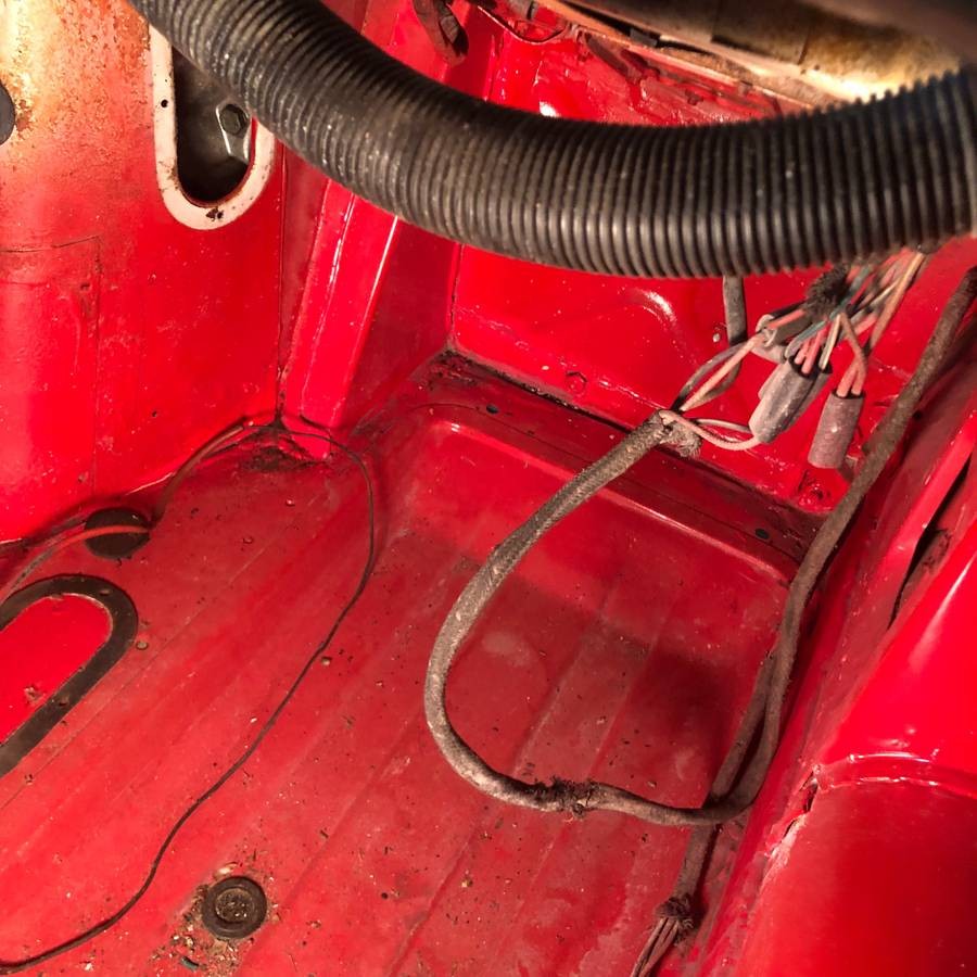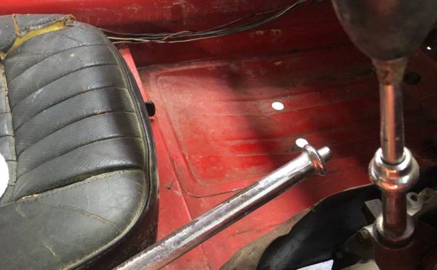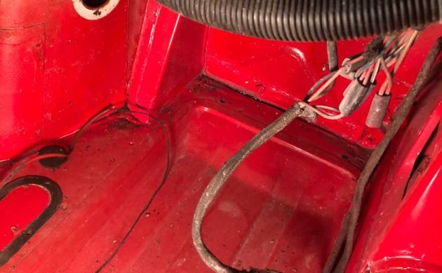 The paint and trim do look good, and the floors are fine. The steering wheel appears quite nice. But there still could be significant challenges here, such as a possible motor and transmission rebuild (the four-speed unit appears to be in place), suspension, brakes, wiring, etc.