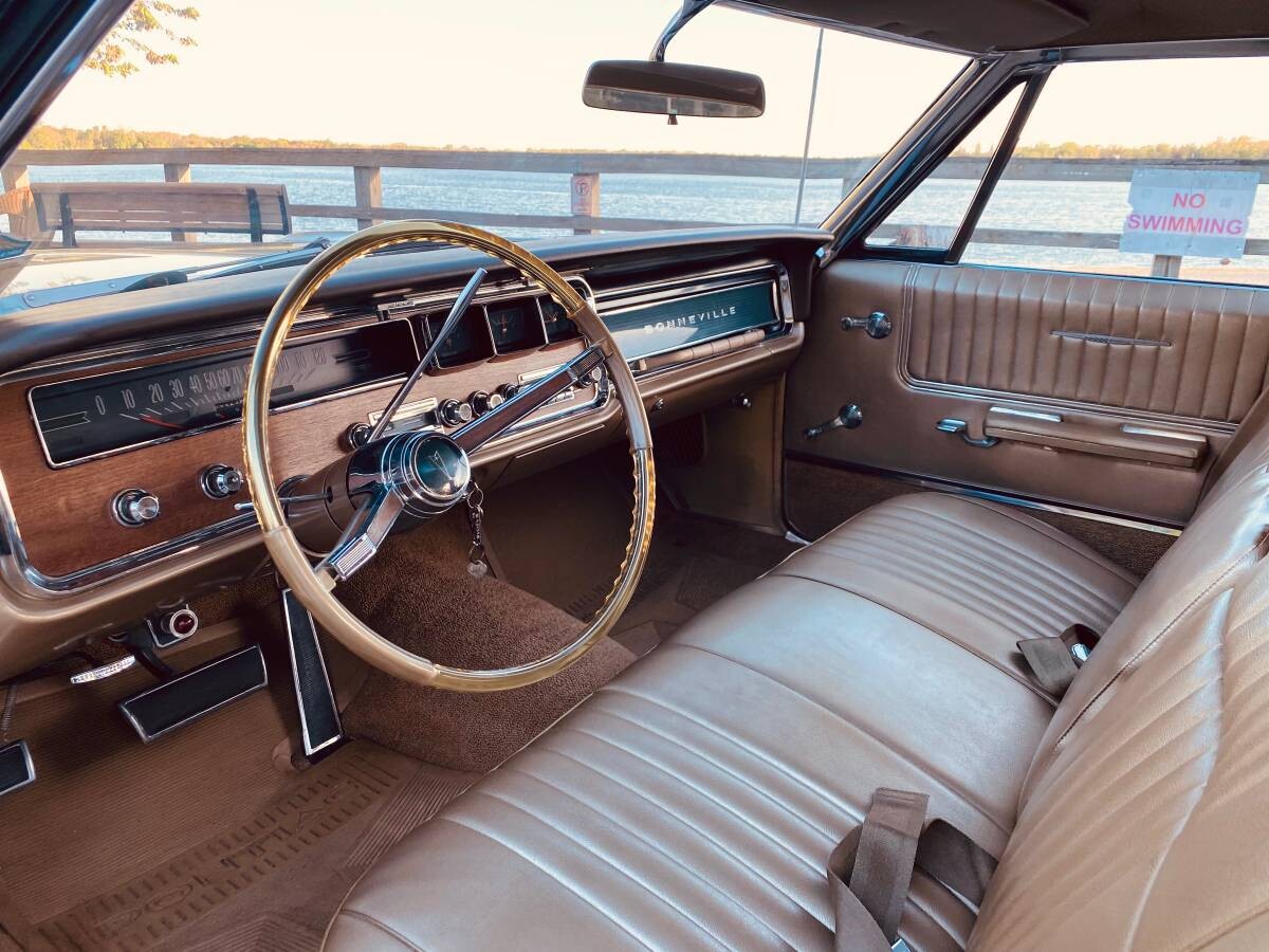 Well, this proves the 60’s was the decade of customization of cars. Evidently you could get whatever you want – or not – on a car. This is a perfect example: A Pontiac Bonneville – the top of the line – with NO air conditioning???!!! WHAT?! ….And with vinyl seats???!!!! — That’s not leather – no texture – that’s smooth sticky vinyl – the cheap stuff you got with the stripped-down stock Catalina. — WHAT?! — My parents were Pontiac people – their ’59 Pontiac Star Chief, which they traded in on their ’66 Pontiac Star Chief – both had factory air conditioning and premium cloth seats – (the kind us kids loved to fall asleep on in the wide back seat on a long trip), and every other option except power windows and power front seat – power steering and power brakes. The ’66 Star Chief also had auto-dimming head lights – remote trunk release, AM/FM power-search radio with 3 speakers – one in the dash and two in the rear deck, etc, etc. It didn’t have the long Bonneville tail lights and the Bonneville name on the side, which made it less expensive, but yet highly preferable to this “stripped-down” version of a Bonneville. Really Weird!
