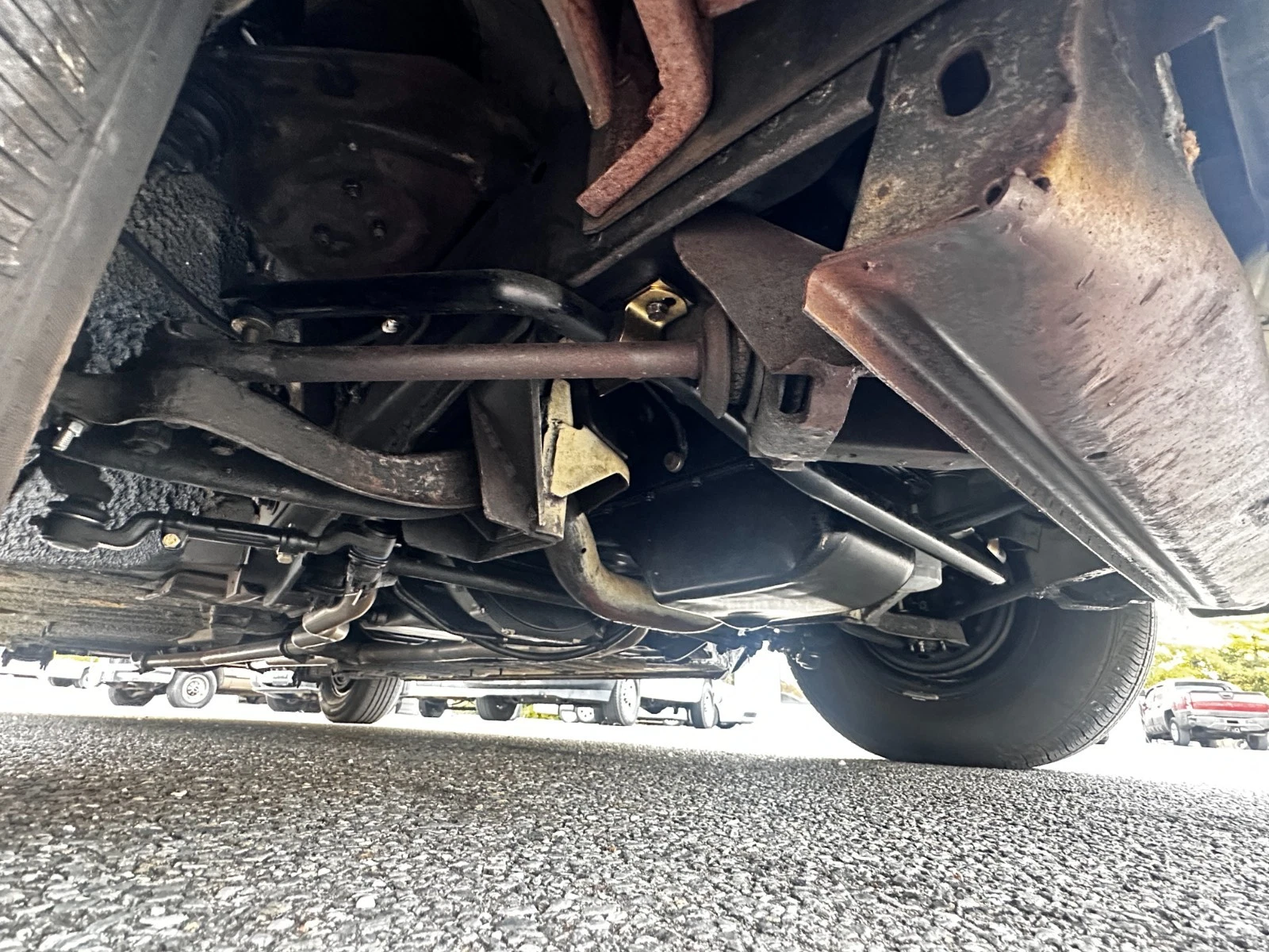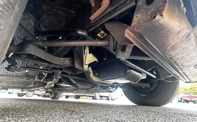 The selling dealer says that the body and undercarriage are rust-free. The exhaust was recently replaced and the front suspension rebuilt; from here, you can see that the tie rod ends are new, as are the sway bar links and bushings. I can’t tell about the ball joints or idler arm, but the strut rod bushings could still use replacement.