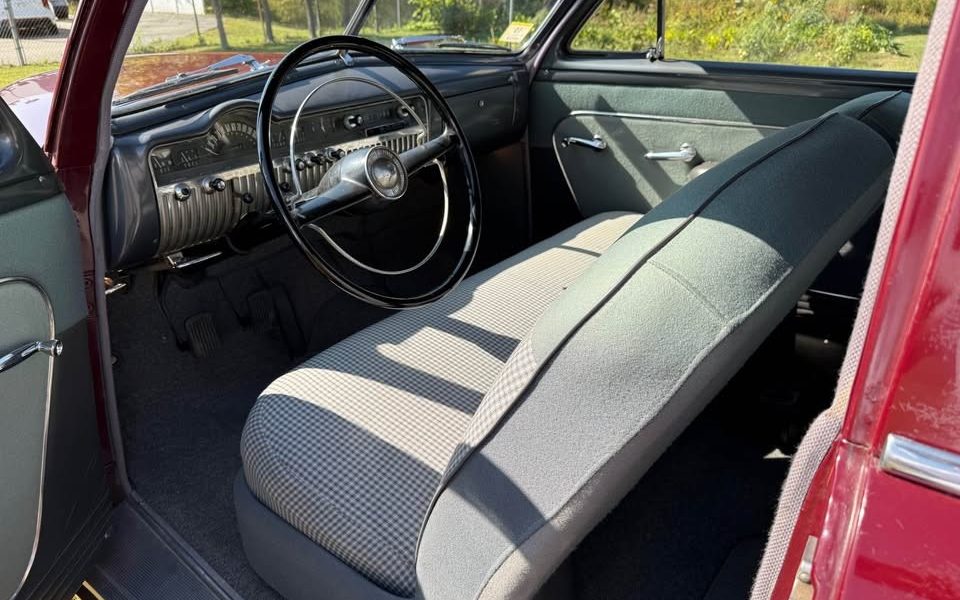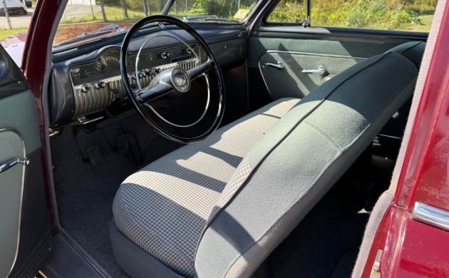 The interior has been restored with “original style fabrics in great condition.” The pattern doesn’t quite match the materials and examples I’ve found online, but there were a lot of upholstery options back then, and they weren’t always shown in sales materials. The seller’s pictures show that regardless of whether it’s exactly original or not, the work has been done well.