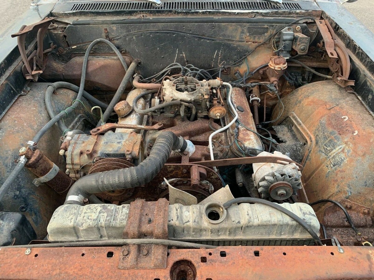The seller apparently has had a collection of vintage cars and has been thinning the herd due to space issues. Back in the day, this GTO was a looker with its Starlight Black exterior finish with red pinstripes and a contrasting red interior. While the rear quarters are quite rusty, the frame and braces are said to be in good shape. The floors aren’t perfect with a few holes to patch or replace. The seller says that under close inspection, you’ll find the original pencil markings on the firewall and the transmission hump. The glass is all good and accounted for, just not represented in the photos. The hood has been removed but survives and another one will need to be on the buyer’s shopping list.