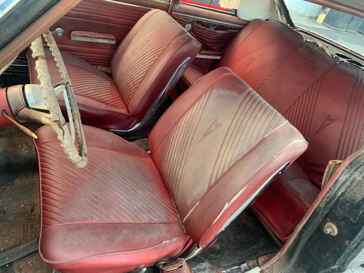 Under the bonnet sits the original, numbers-matching 389 V8 with a 4-barrel carburetor which is the engine set-up that went into two-thirds of production for ’65. It’s paired with a 2-speed Powerglide automatic. The motor does not turn, either mechanically or by hand, so it has been sitting untouched for years. The dealer-installed aftermarket air conditioning is still in the car and the plumbing is all there, but it’s unlikely that it works now, either.