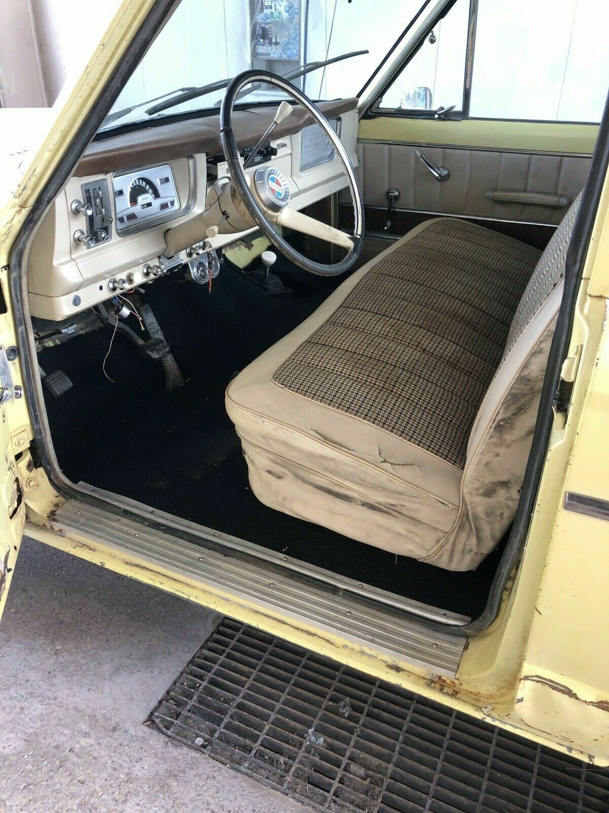 The bench seat looks a little frumpy nextg to the new carpet and nice look dash. I just rebuilt a bench seat in my 1966 GMC K1000 and it is not that hard to do. I don’t know if they make upholstery kits for the J2000 but I would think that it would not be that hard to bring the seat up to looking like new. There is a small rust hole in the floor board by the gas pedal. The transfer case has a lot of play in it and will eventually need to be rebuilt.