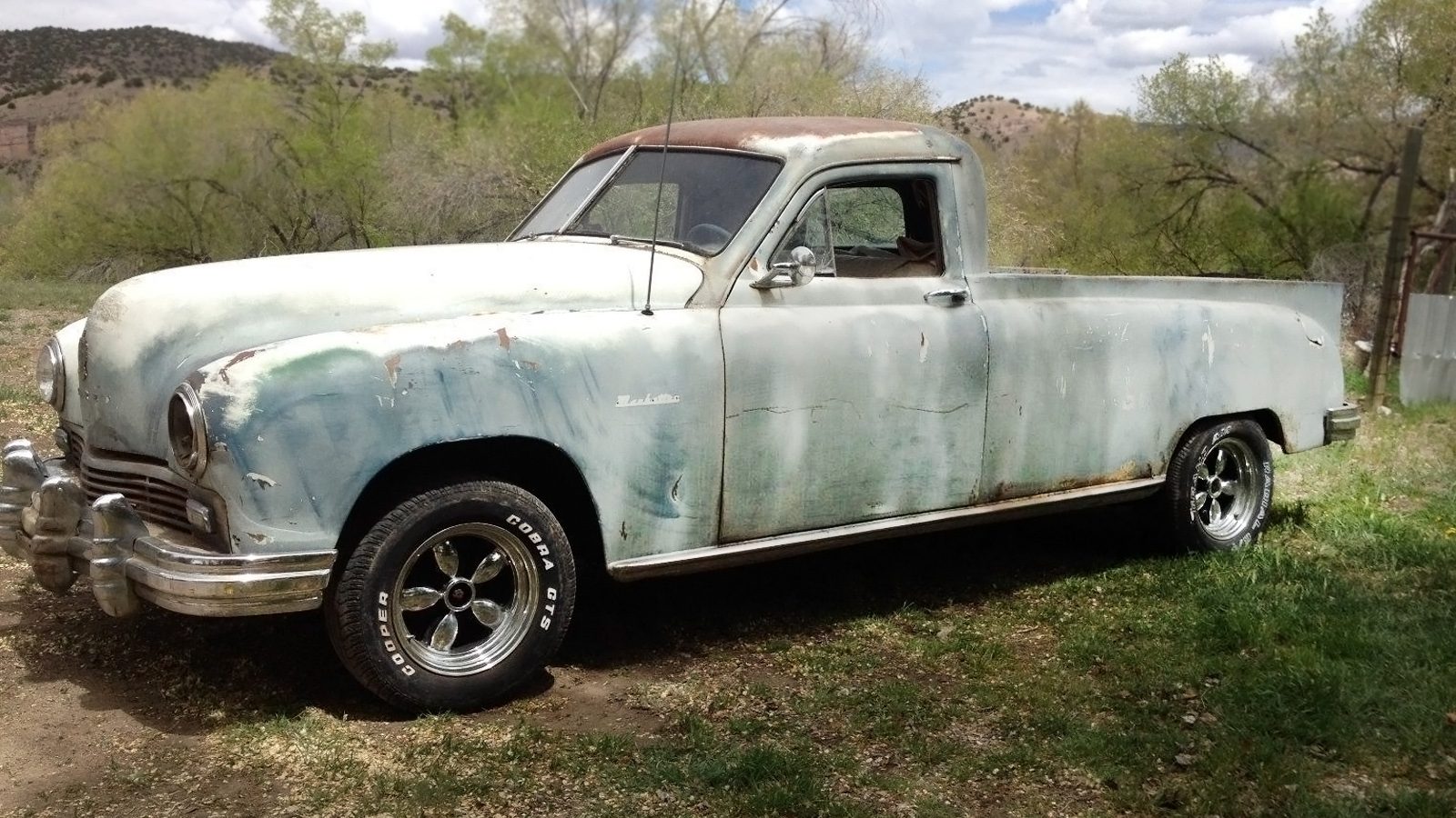 There’s a mad story behind this mad truck. The story goes that Earl “Madman” Muntz, one of the biggest Kaiser-Frazer dealers in the country, wrote a giant Price-is-Right-sized check to have three Kaiser-Frazer concept pickups built to see if there might be a market for an upscale pickup, and this is one of the three, I think, possibly. It may be the last original truck, other than the obviously non-original wheels. Frazer cars were a cut above their sister cars, Kaiser, sort of like Mercury is/was/is to Ford, and both Kaisers and Frazers were built in booming post-war America by the Kaiser-Frazer Corporation with WWII ship building extraordinaire Henry Kaiser at the helm, so to speak.