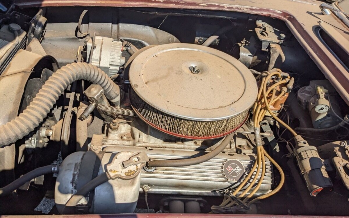 This is great and it’s a real garage or barn find! So it’s not original that happened. Get caught up ripping on it, over rev it and a rods knocking or main bearing give up. Was a used car drop another small block in the car and motor on. Yeah wheels are wrong but it looks good. A thorough cleaning, go through the mechanicals and replace that rear window. Not a show car , motor is long gone, drive it and enjoy the ride.