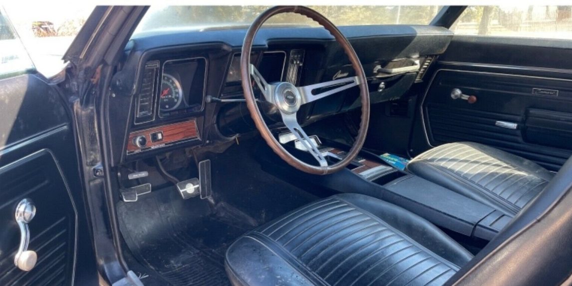 This car was originally painted Fathom Green from the factory but at some point, it was painted black. There is a dent in the passenger front fender and some nicks and scratches all around the car. This interior looks pretty nice but an astute buyer would notice that the shifter is missing which comes with the car but is not installed. The car comes with the Muncie 4 speed that is said to be the proper date code. The glass is said to be nice and extra parts are located in the trunk.