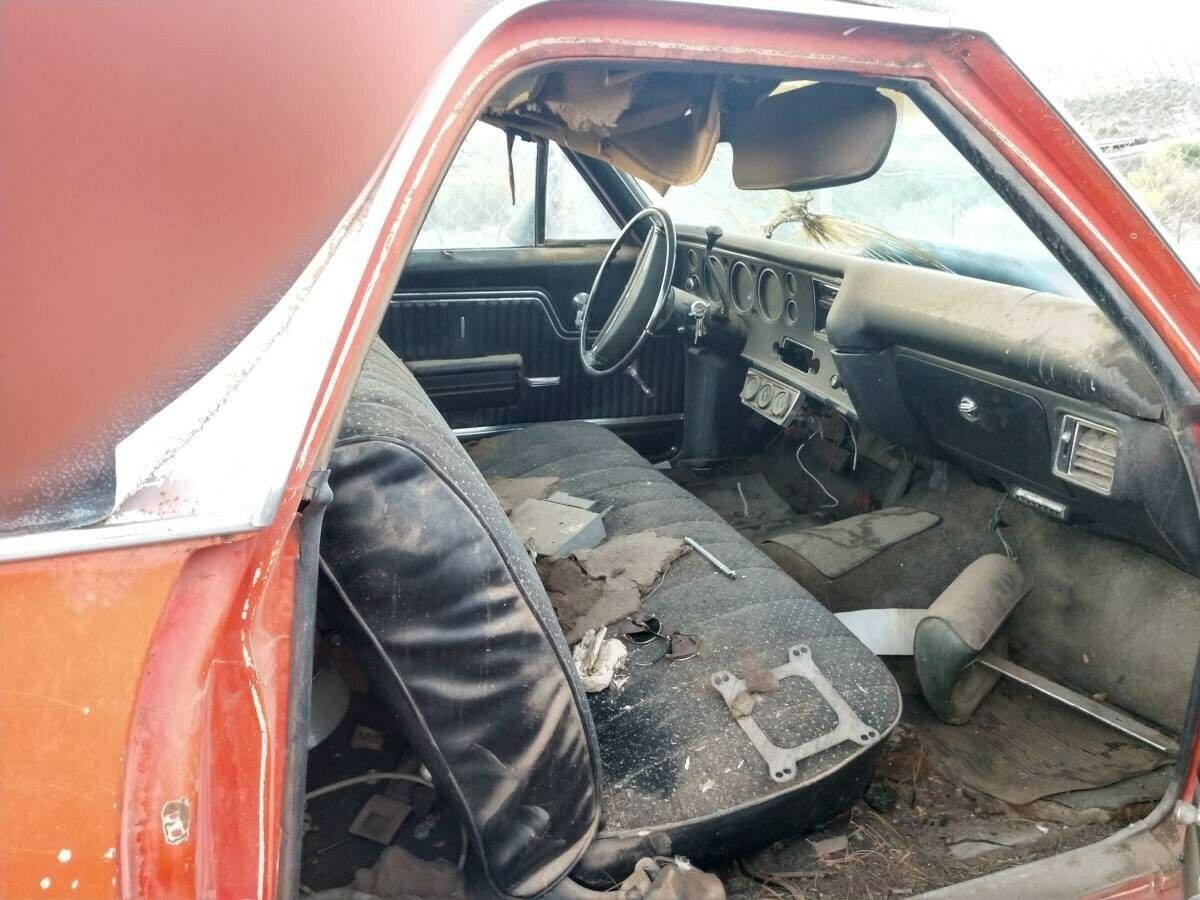 When it left the factory, this El Camino wore white paint and a black vinyl top. Today, it has rough orange paint that resembles Hugger Orange and the vinyl material on the roof is long gone. While the truck has a bench seat and a column shift for the tranny, the seller has a set of Malibu bucket seats and a console with floor shift that was planned for the Chevy. A new dash pad and rebuilt tilt steering also come along for the ride.