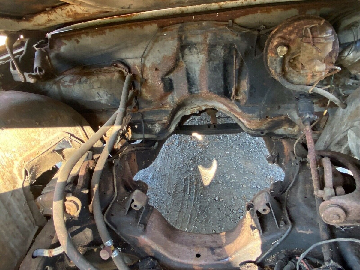 As this car has never been subjected to a cosmetic restoration, what you see is what you get. It still wears its original paint, which could have been Ermine White or something similar. Besides an assortment of surface rust, both front fenders contain blight and may have filler in them that was never painted over. That corrosion is accompanied by rust in the front floor braces on both sides as well as the rear body panels, deck lid, and a bit in the trunk floor. The seller advises that the floorboards, rockers, and lower rustable places on the Chevy are still good.