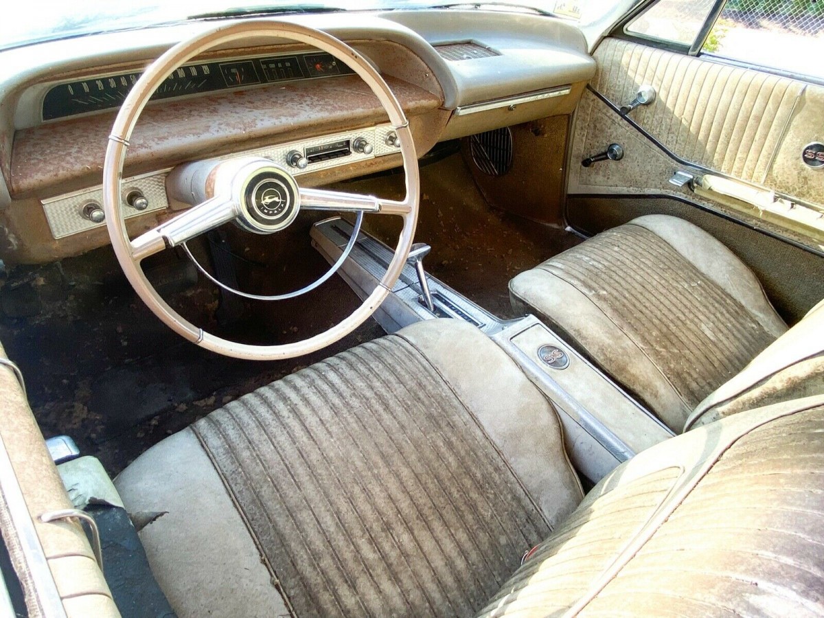 The white/black interior is also original and much of it may come back with a thorough cleaning (lots of dirt and mildew). All the glass is said to be in good condition and the windows roll up and down as they should. The driver’s side door needs adjusting, and the hood engines are bad, so it won’t open all the way. Besides the MIA drivetrain, the front bumper and grille have also taken flight and the original wheels are in the trunk although the SS wheel covers aren’t mentioned. It sports a like-new set of Enkei aftermarket rims. As far as projects go, this car may show more promise than many others we’ve seen that have been off the road for decades.