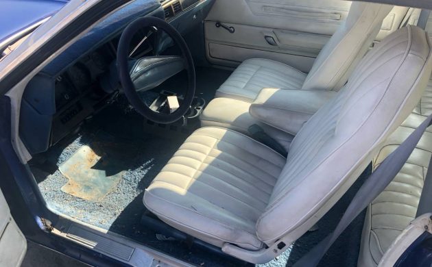 Inside, we find a white vinyl upholstered bucket seat environment, and this is where age and use have manifested themselves. It’s not in bad shape, mind you; it’s just dirty, yellowing in places, and could use a deep cleaning. The driver’s door card is another matter; that will need to be replaced. The instrument panel is about as basic as they come, not what’s usually in keeping with Mopar standards. The dash is wearing a topper, so expect a split dash pad. This is an A/C equipped car, but its operational capability is not referenced.