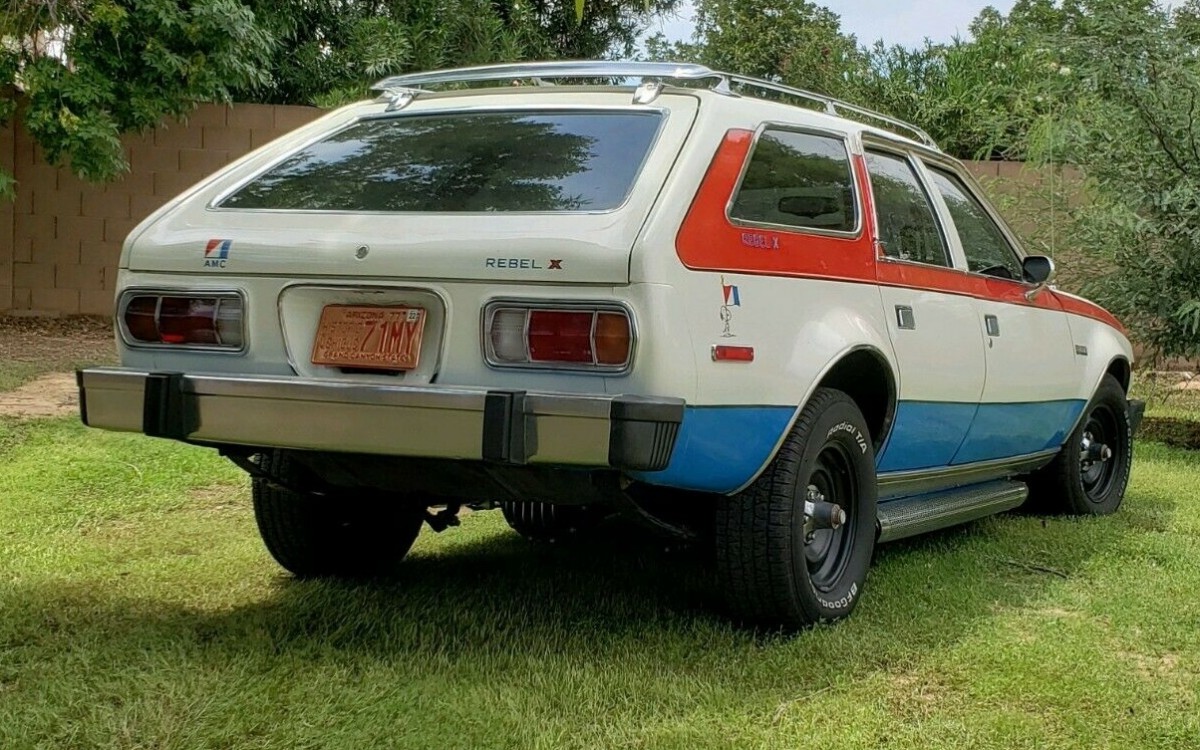 This Concord Wagon left the factory with a 304 cubic inch V8, but under the hood now is a 360 V8 paired with an automatic transmission. Aftermarket engine parts include an Edelbrock intake manifold, Holley carburetor, and headers connected to a side pipe exhaust system. The car has a custom paint job that sort of mimics the Rebel Machine, a one-year AMC offering in 1970 that looks like this in case you are not familiar with it.
