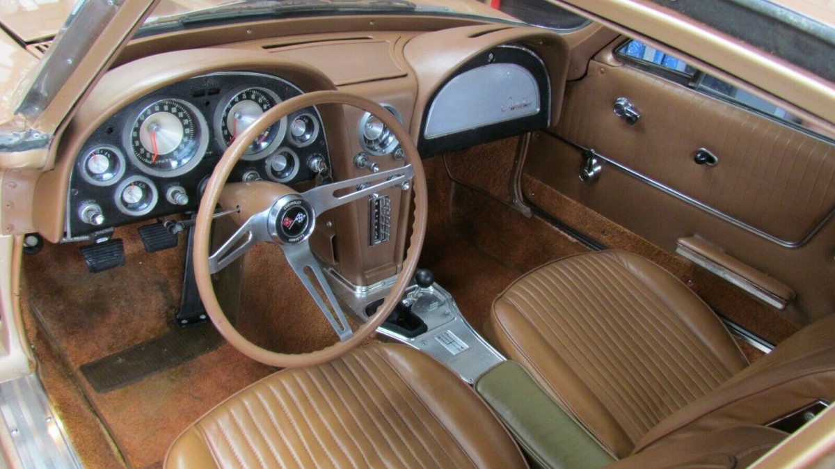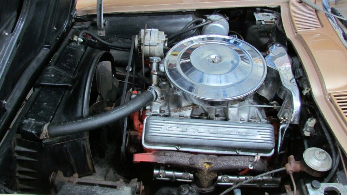 The Corvette’s interior is as original and unmolested as the rest of the vehicle, and its condition is more than acceptable for a survivor-grade car. The carpet is looking faded and marked, but that is one of the few faults that is worth noting. The Saddle leather upholstery on the seats has some slight stretching, but there is no evidence of wear. The armrest on the console is discolored, but the remaining trim, the dash, and the console itself are all in excellent order. The original radio is intact, and everything is said to work as it should. This includes the often troublesome clock, which is a bonus in a Corvette of this vintage.