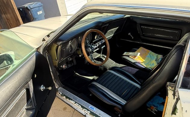 This Mustang’s interior brings equal servings of good and bad news. Trimmed in Black, the seller indicates that the door trims, carpet set, and wheel are new. However, there is visible cosmetic deterioration across some plastic surfaces, and the faux woodgrain has failed on the door inserts. The radio is missing, and the headliner and driver’s seat are split and ripped. It probably doesn’t require a complete retrim, but the shopping list will include new seatcovers, a headliner, and a woodgrain kit, all of which are readily available, to present at a higher level.