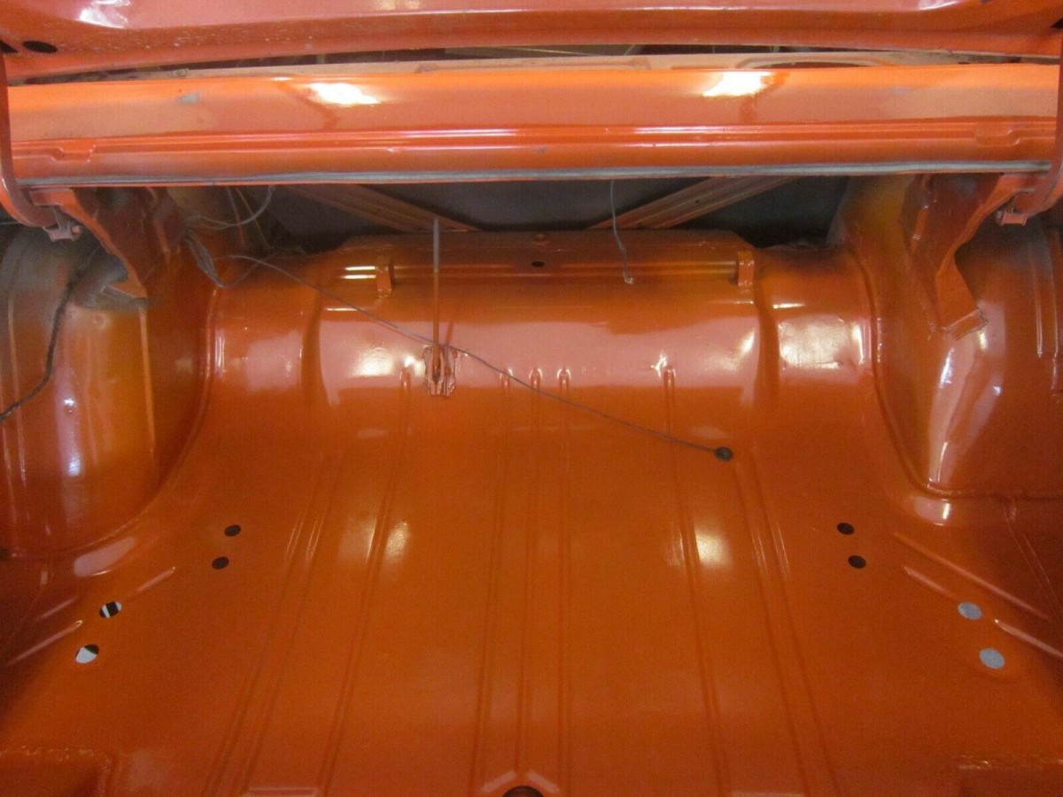 Most of the Tor Red paint is original (code EV2, which was called Hemi Orange at Dodge but Tor Red at Plymouth, which was a play on the word “torrid”). The engine compartment was repainted when the drivetrain was out. And the trunk floor was replaced and repainted as it had rusted out. The floorboards are said to be in good condition although a fresh coat of primer in the back suggests a patch or two. Some work was also done on both rear quarter panels and the lower channel of the rear window was replaced with a deck filler panel.