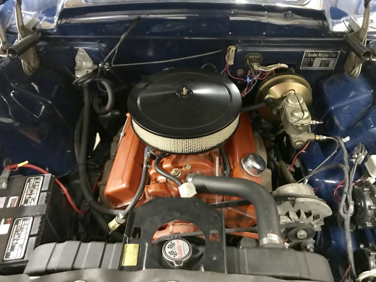The original owner decided that he needed a bit more get up and go from the Checker, so the original 283ci V8 was consigned to history, and in its place is a 350ci Chevrolet engine and Hydramatic transmission. During the 2012 refurbishment, the car received a new engine bay wiring harness. The car has also received a new 4bbl double-pumper carburetor, a new electronic ignition, and the radiator has been re-cored. There are still a few detail items to be attended to, but there is nothing major.