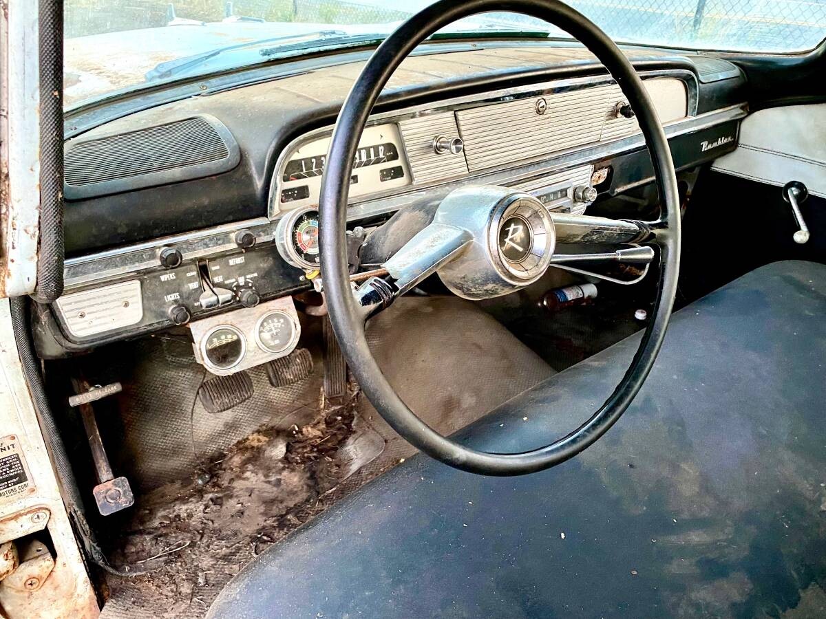 This stuff seems to be coming out of the woodwork as time marches on. More accurately, elderly owners are having their stuff gone through. Probably 0% chance of any restoration. For the record, in ’59, and well into the 60s, we “local Rambler folk”, never said much about the “AMC” name. To us, they were always Ramblers. I read, in 1966, Roy Abernethy, then president, convinced the board Rambler had a stodgy image, and slowly, the Rambler name fell to the wayside. The last one was the 1969 Rambler American. To say the motor was AMC isn’t exactly true, I think more of a Nash design. I don’t think this car has O/D, more of a Studebaker thing. I’ve seen a lot of Ramblers, many 3 speeds, and never an O/D. O/D was a road thing, and most Ramblers were city cars. If the clutch is bad, and there’s every indication it is, it’s a big job. Again, it’s a neat find, makes me think of home, at least how I remember it, but they have to be nicer than this for any interest today.