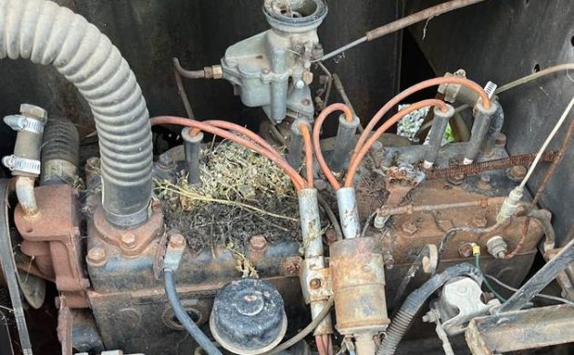 The engines were rebuildable 1940-1950 Plymouth mills, often the early ’40s 201 cu. in. flathead six. This engine was good for 87 hp and backed by a column-mounted three-speed manual. The cylinder head here has been commandeered by a critter looking for affordable housing. It doesn’t run, but the seller assures us the drivetrain is original to the car. By 1956, the bumpers were made of steel rather than oak; other than this, very few changes were made over the three years of production. Notably, the bed was part of the cab, not installed separately.