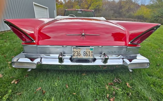 The Lincoln’s interior is a wonder to behold. This is what opulent luxury looked like in 1957. The red and white “Button-and-Biscuit” leather seats with the white bolsters are beautiful and don’t appear to be showing any wear or damage. The cool door panels continue the space-age theme and except for a few wrinkles on the black padded dash, the interior looks near perfect. Although not photographed with its convertible top up, the seller’s says in a walk around video that the white convertible top is in very good condition and works properly.