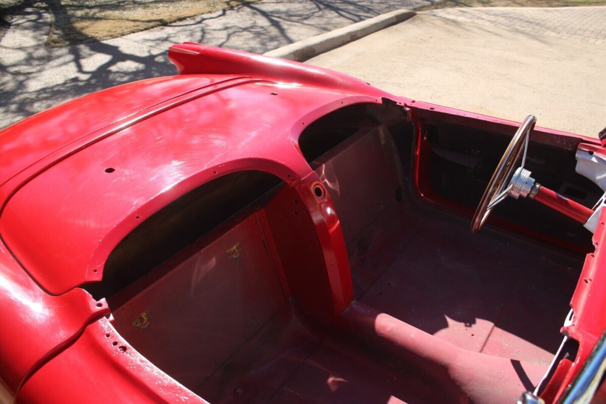 The car you see here is described to be one of the original Sportsman Red cars. It has been disassembled, and a large amount of restoration work has already been completed. The frame has been stripped and powder coated, and the engine has been rebuilt, as has the front suspension and the braking system. The body is described to be basically all there and in good shape. The paint, however, is described as “10-to-20-footer” in quality and would likely need to be completely stripped and redone. There are some missing pieces here and there, and the ad is written in a way that makes you think this was an incomplete car when the project was started.
