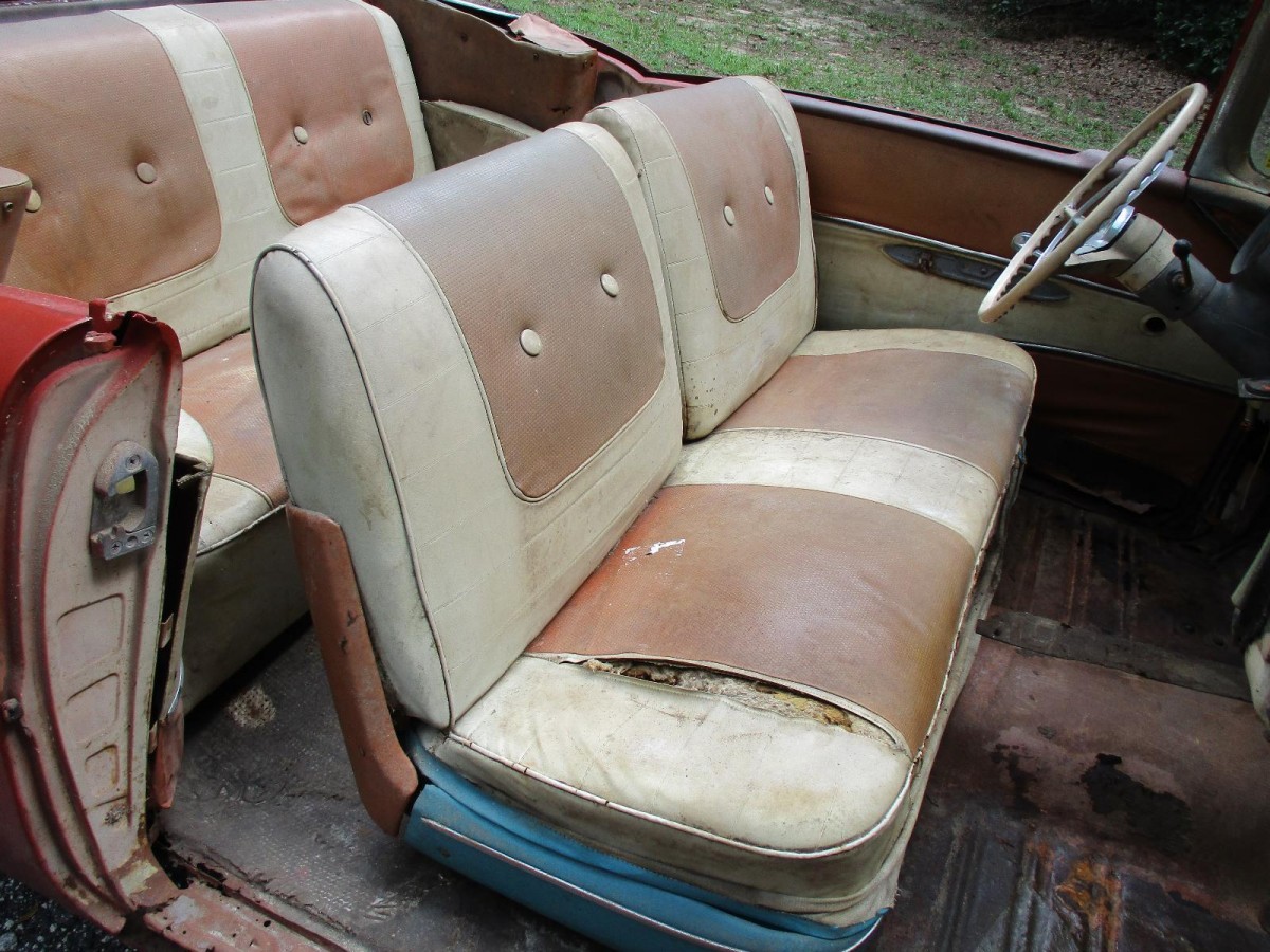 There it is in all its red and rusty glory. Even the new replacement sills are rusty. There are lots of possibilities for this droptop but most aren’t promising. Perhaps the best thing would be someone with lots of skill, money and time who will take this on and be able to finish a restoration. The winner might take his prize home and soon realize how much work and skill it would take to restore this car and give up. Hopefully, it won’t end up in a body shop that will suck up the buyer’s money and never finish the project. Do you think any really good, honest shops would take this on instead of suggesting the customer find a better car? It will be interesting to see how much someone is willing to pay for it and to know what their plans are for it!