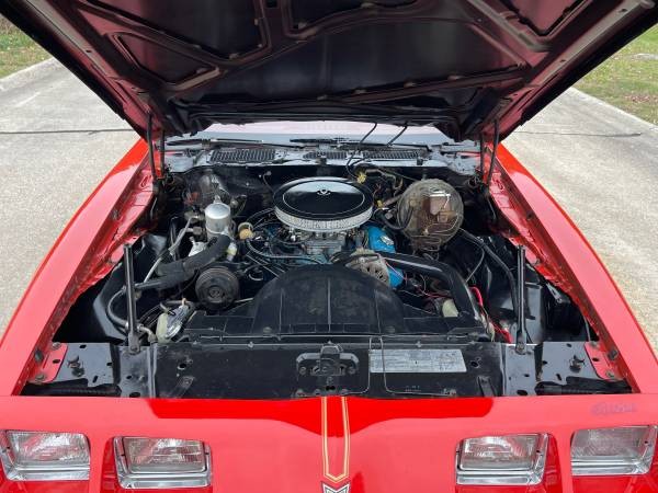 The Redbird had several engine options including a standard 231 cubic inch Buick V6 for fuel efficiency and a more powerful 301 cubic inch V8. The 4.9 liter V8, in its third year, came with either a 4 bbl (L37) rated at 150 horsepower or a 2 bbl (L27) rated at 140 horsepower. In California, the Chevrolet LG3 305 cubic inch V8 was available, producing 133 horsepower, compared to the 105 hp of the V6. The engine compartment looks clean and well maintained. There is no mention if the AC works but the equipment is located under the hood and it looks like the AC belt is missing.