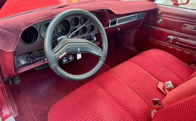 Inside, we find matching red fabric upholstery that appears to have withstood the test of time and use. The door panels, carpet, and instrument panel are in fine shape, though I imagine there’s an issue with the dashpad that’s lurking under the topper. The seller mentions that there is “a small air conditioning leak,” which I take to mean the system isn’t working as it should.