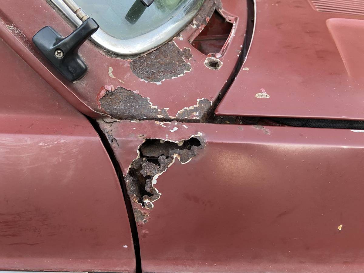 Our poor little gopher wagon was terribly eaten by the tin worm, the worst I’ve ever seen on a 128. The bottom of the right front fender had been pop-rivited to the cowl, and when the cowl rusted away, the fender flapped with the wind. The bottom several inches of the outer door skins were simply gone. The top inner cowl areas leaked during rain, but other than trying to keep your feet dry, the rain water simply ran out the gaps between the plywood floors and the main body shell, as the floors were gone. What finally led to it’s demise was when the rear axle mounts rusted away and the axle shifted back several inches!