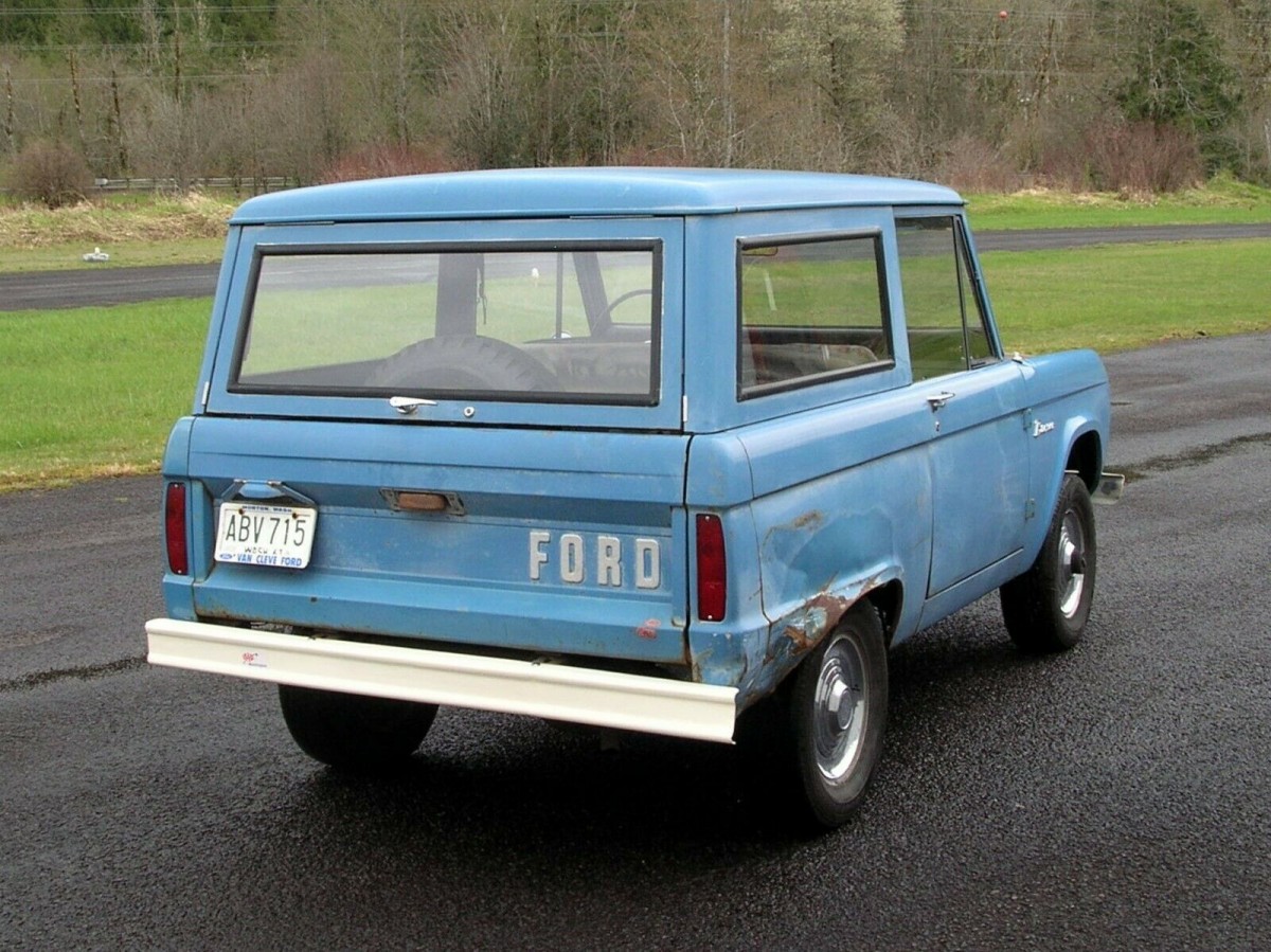 The interior is spartan but complete, with a factory bench seat and three-speed manual transmission. The dash looks to be in excellent, crack-free condition, and the door panels are quite tidy as well. Even the original steering wheel is in very good cosmetic condition, and the cabin gives you the impression this Bronco was never put away wet. There is some rust in the floors, and photos show an old license plate used to fix a hole under the pedal box.