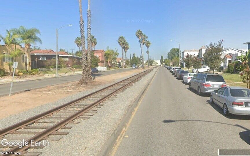 this an old LA Pacific Electric streetcar byway leftover most likely from the 1920s-40s, repurposed into a rail track. Not Mexico, not in anyone’s ‘front yard’. The post laments the loss of this poor guy’s El Camino – simple as that. Not really a platform for your wanker dissertation on the Decline of America.