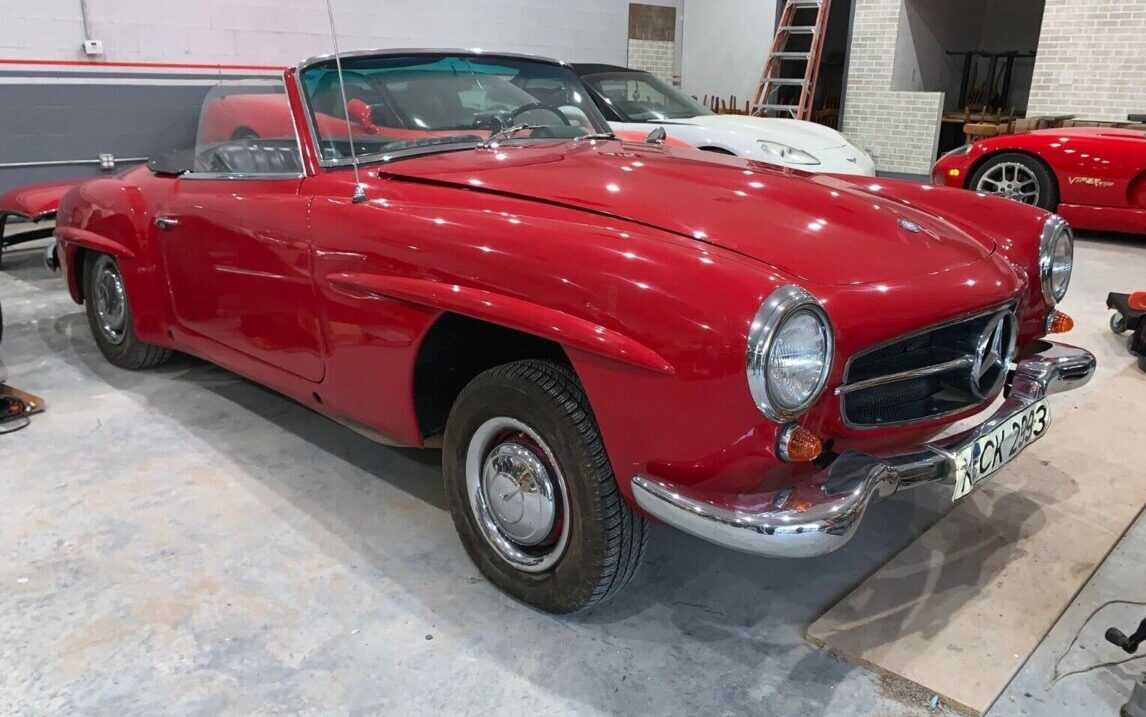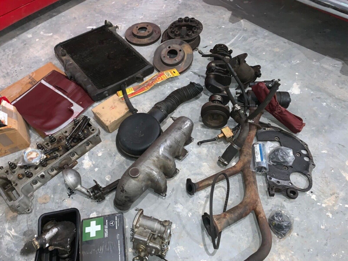 This car’s motor and transmission were removed at some point. The engine was disassembled and the block was stored outside the shop where the car resided. The block, some engine parts, and transmission are shown in the listing photos, but it’s difficult to know what’s missing. At any rate, if a buyer were to reassemble everything to stock, he’d have a modest performer, generating 105 bhp, that managed zero to sixty in about 14 seconds. The 190SL was not a barn burner, but it was pretty.