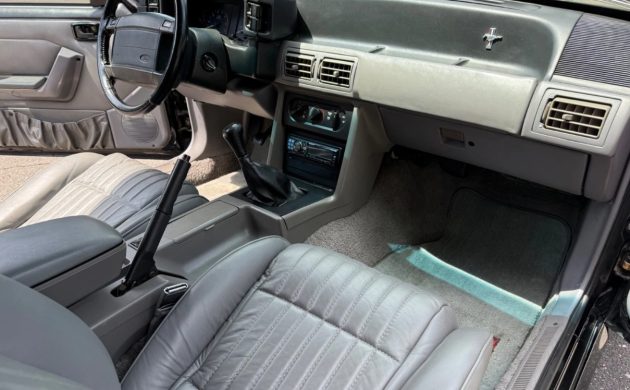 As with the exterior paint shades, Ford offered a limited selection of interior trim options to ’93 Cobra buyers. This car’s first owner teamed the Black exterior with Oyster leather trim, as chosen by 1,079 people. It proved the most popular choice, providing a stunning appearance that undoubtedly drew praise when this gem left the showroom. The car’s overall condition reflects its sheltered existence. Apart from the typical sagging door pockets, there is little inside this classic that deserves criticism. The leather is free from wear, the carpet is clean, and the plastic is excellent. The previous owner replaced the original CD player with an aftermarket Alpine unit, and the seller has tried unsuccessfully to locate a genuine one to return the interior to its factory specifications. Other factory features include air conditioning, power operation for the windows, locks, and mirrors, and cruise control.