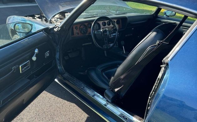 The interior of the car looks nice and shows that the car was optioned with remote mirrors, air conditioning (not working) and a Formula wheel. On all Formula models, the 3 spoke Formula wheel was an option. The 7.4 liter engine is backed by a GM turbo 350 automatic transmission per the seller. From the factory, the car should have the stronger GM turbo 400 automatic transmission. The interior shows that the car is nicely optioned with a black deluxe interior which included more supportive seats and upgraded door panels.