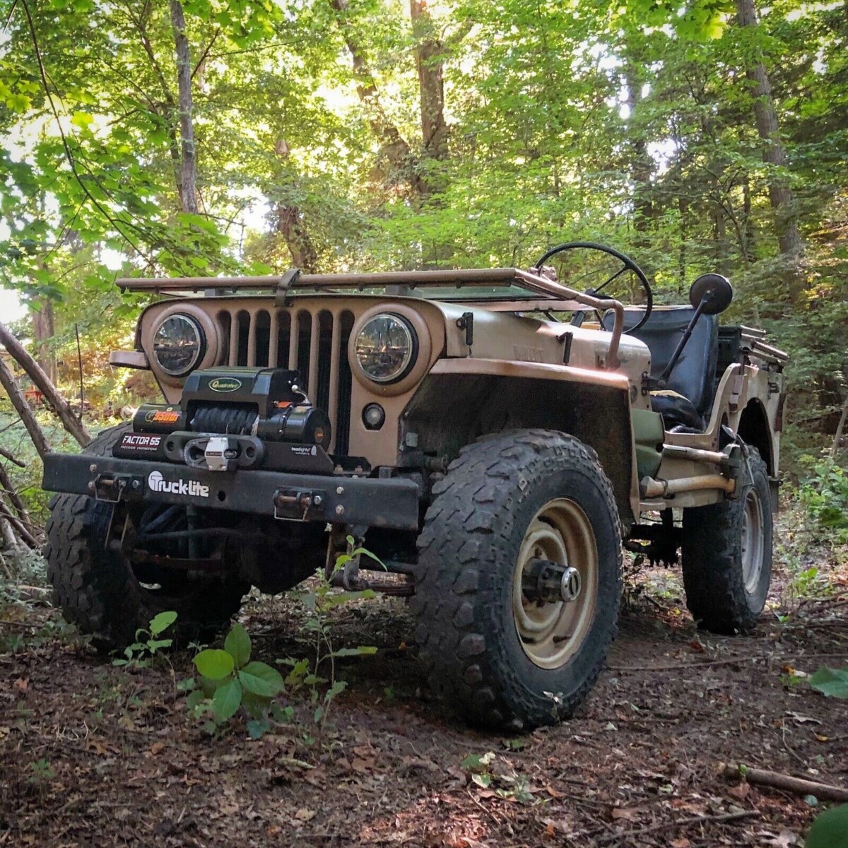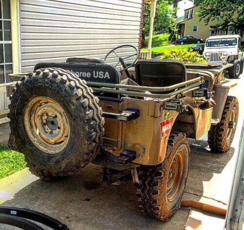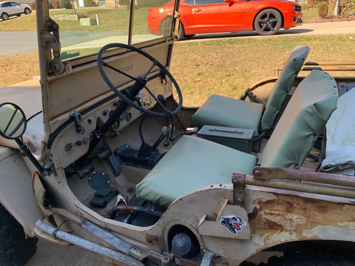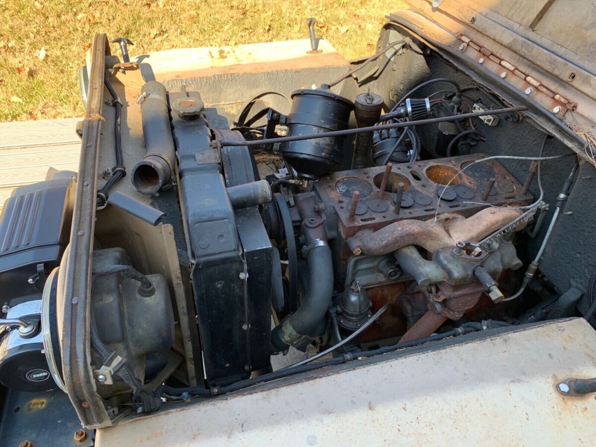 The interior has also been altered to suit the seller, with Cordura seat fabric and an extended driver’s cushion to accommodate a 6′ tall person. The body has also been altered to fit the seat. The soft top frame, custom console, and two ammo boxes are included. The two-part windshield lasted through 1959. The lights have been swapped to LED bulbs.