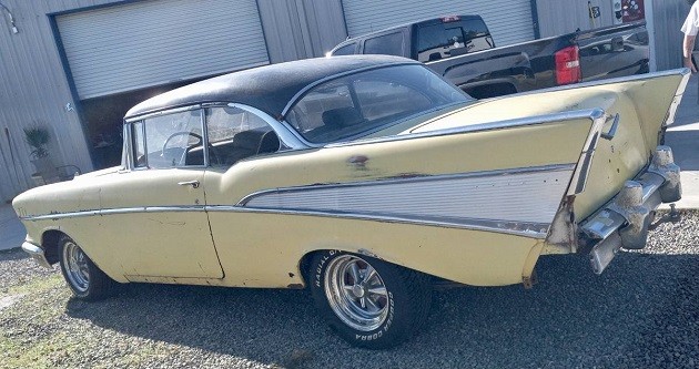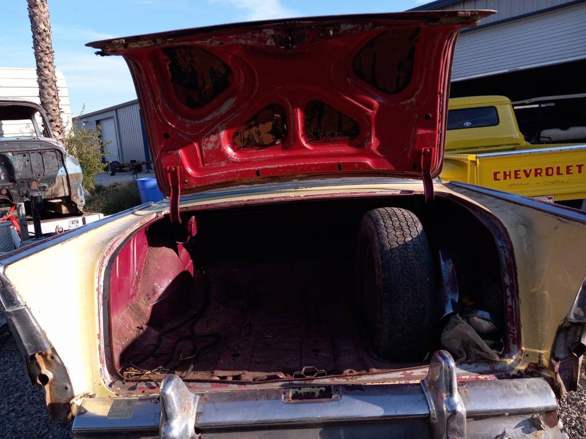 Out of 1.56 million Chevrolets built in ’57, more than 168,000 were the Bel Air Hardtop Sport Coupe like the seller’s car. It would be the second-best-selling Bel Air that year, only beat out by the more pedestrian 4-door sedan. The seller’s auto is a project car, but the question becomes how deep does the project part of this car go? The black over yellow paint is not original as you see nothing but red when you open the trunk. We’re told there is minimal rust on the passenger side fender, but the rocket panel on the same side may need some help.