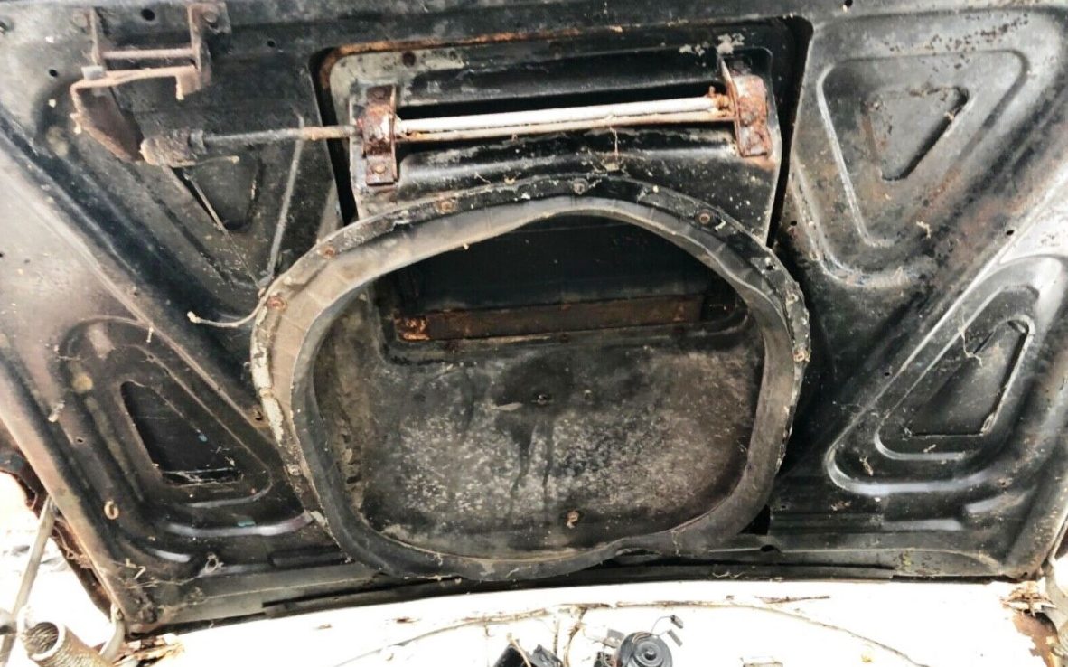 Any car is “restorable” if cost and effort is no barrier. Reviewing the eBay listing for this 1970 Plymouth Road Runner in Conshohocken, Pennsylvania, its relative completeness stands out as truly remarkable. It’s rare to find a N96 “Air Grabber” hood on a car in this condition, and, despite some rust, the N96 hood makes this true barn find more interesting for sure. Along with the N96 hood, this car’s body tag pedigree confirms it as a true Road Runner with the base engine for that package, the 335 HP 383 cid (6.3L) four-barrel V8. Thanks to MyMopar and lov2xlr8 for some details. So far at least a half-dozen bidders have driven the value of this whitewashed B-body above $4800.