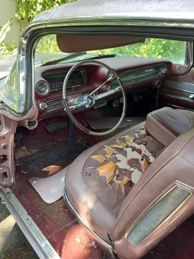 We’re told that this ’60 Caddy runs well and the transmission shifts fine, yet from the photos it looks like an auto that hasn’t moved in some time. If it runs, why not move it back a few feet to take some pictures of the front end of the car, which we don’t get to see? Surely the 390 cubic inch V8 rated at 325 hp could manage to move out into the parking lot. A Carter 2-barrel carburetor was standard (using Premium gasoline), but you could get a 6-Pack set up that added 20 extra horses.