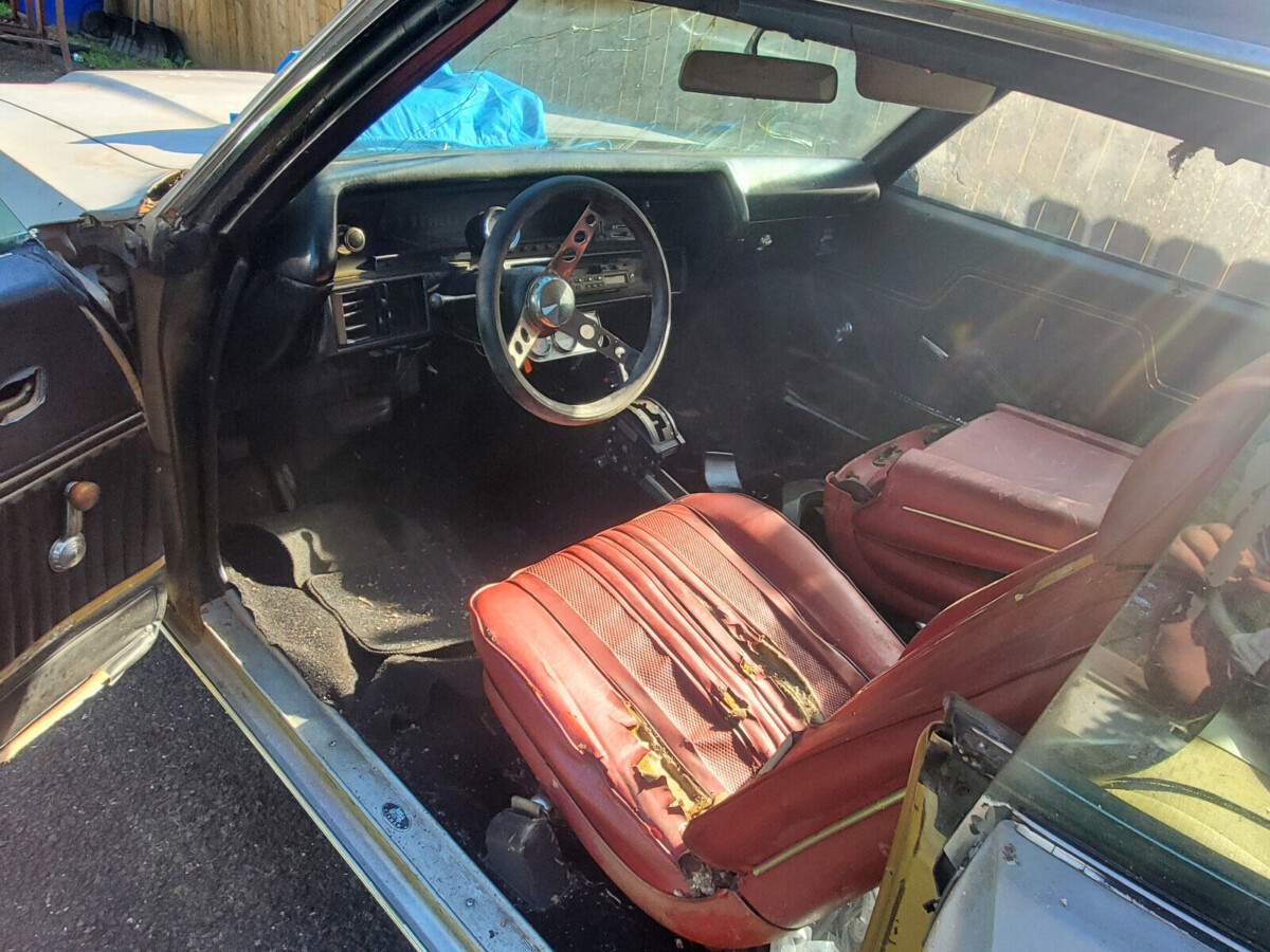 Though primer gray is present everywhere you look, the cowl tag says this Chevelle left the factory in Champagne Gold. Which would explain the black vinyl top and a (mostly) black interior. We’re told the frame is solid and the floorboards are fine except for a hole under the driver’s foot. The trunk looks clean, too, although we’re told there are a couple of small holes. Extra sheet metal and other items collected over time that go with the car include a passenger-side door, windshield, both front fenders, some trim pieces, and a spare grille. The interior is currently mismatched, but the seller says more bucket sets will come with the deal.