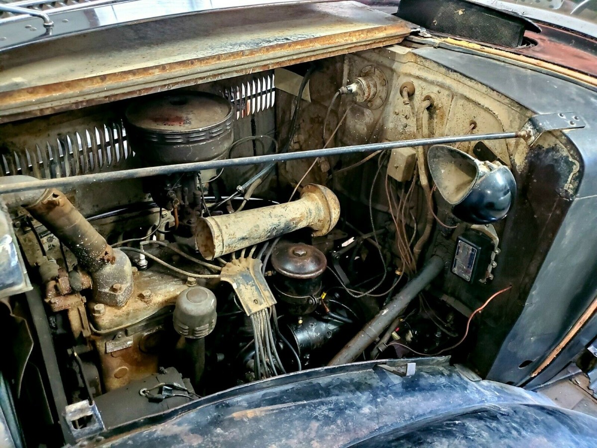 Looks to me like this ole girl was a light gray originally by the color of the firewall.The fenders appear to have cracked and been welded up. Drives okay? Yeah I imagine if you think your old car should wander all over the road. The interior is just a little too ratty to suit me. The rubber floor mats are crumbling and the upholstery is going fast. My guess from the engine pic is that she’s blowing some oil too.If I wasn’t so old and tired I’d take her on tho. Beautiful lines and a great start to work from.