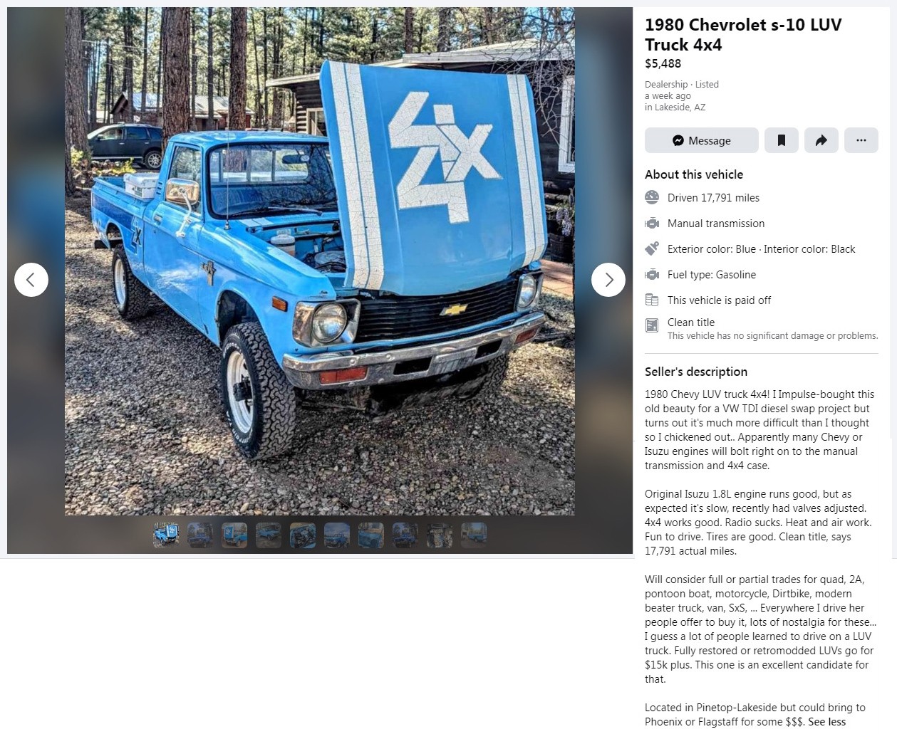 I bought a 76 Luv a couple years ago for $1500.00 but it needed a lot of work. It was brought to me to Texas from Alabama by the seller. It had a lot more rust than he told me about and I should have sent him away but I bought it and began working on it. A lesson learned; put the title in my name before ever putting a wrench to any vehicle. Turned out the Alabama title was non transferable and Texas wouldn’t issue me a new title. So it got parted out. Hope the buyer of this one has better luck. Seller should have a clean title in their name or no deal.