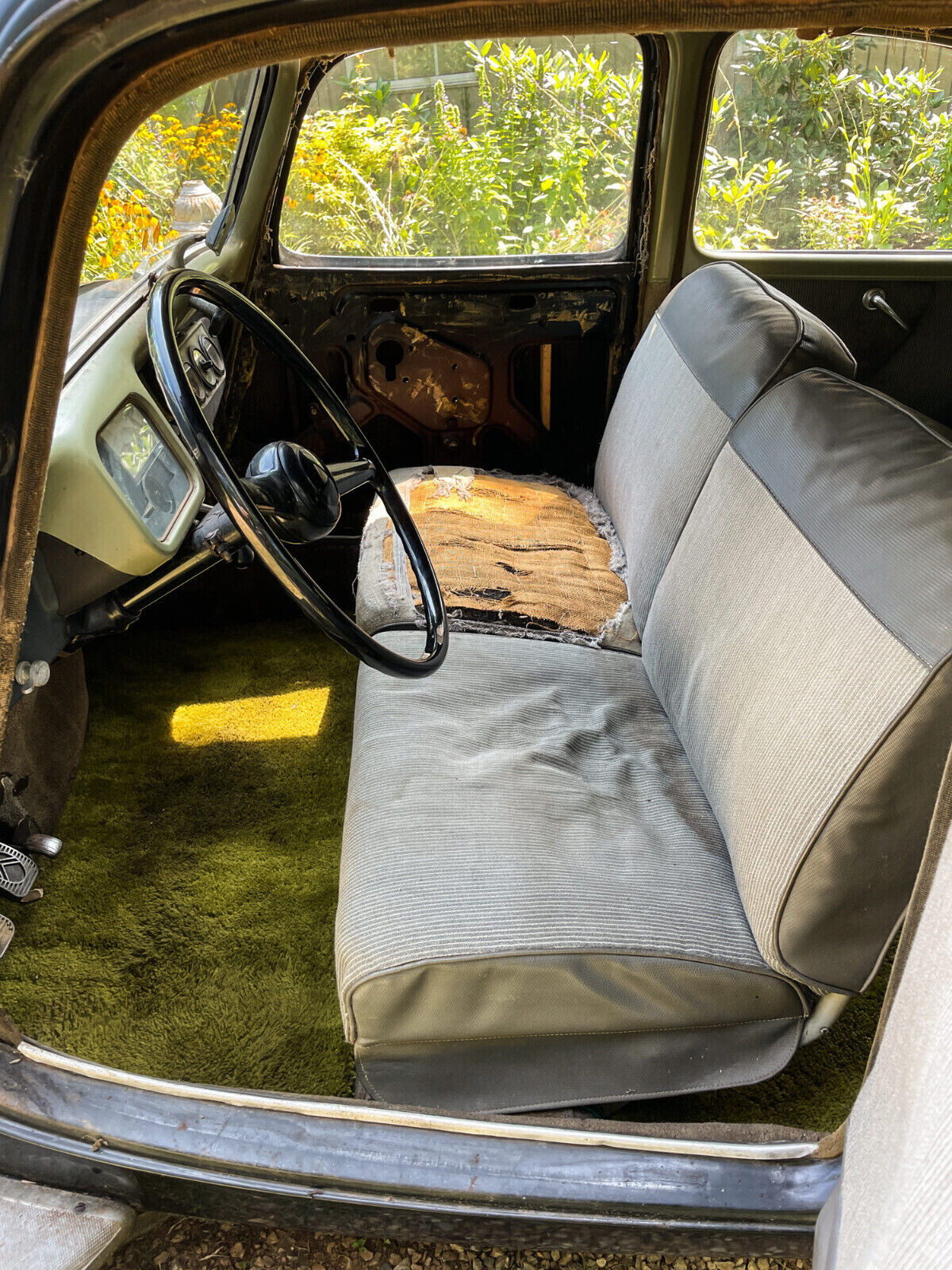The interior needs work, but with the sale comes new grey upholstery. The green shag carpet is a modern nicety, and aftermarket gauges are installed on the dash. The headliner … isn’t. The front door panels are also missing. Speaking of doors, all four-door Traction Avants had suicide front doors and conventional rears. The broad flat floor was a big advantage in the market back in the ’30s, allowing the car to seat five or tote a lot of merchandise.