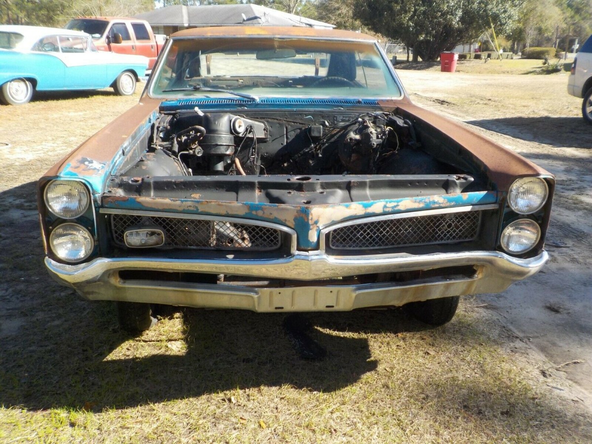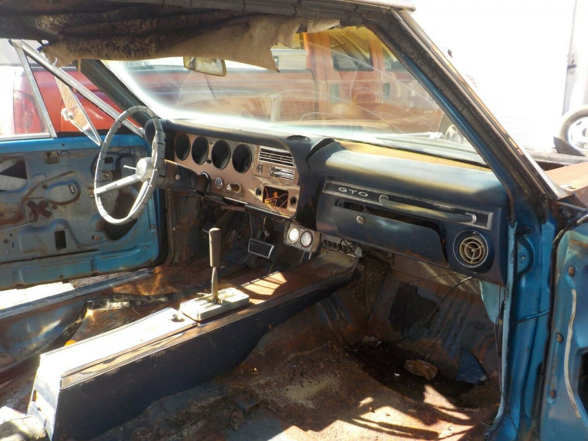 The fender tag confirms this car as a genuine GTO (VIN code 242). The GTO engine was upgraded from 389 to 400 cubic inch between ‘66 and ‘67, and a 4-barrel carb set-up (we assume) would have given it 335 hp. However, that engine and its automatic tranny are not available to go with the car. It seems to have been a well-equipped GOAT with factory A/C, power steering and brakes, and the “His & Her” shifter in the console.
